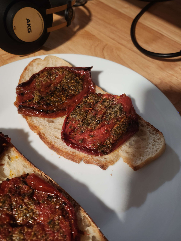 (pesto-stuffed tomatoes on sourdough, fucking delicious)