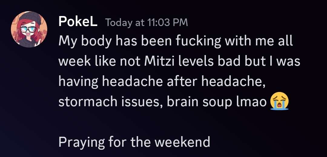 which absolutely sent me. good to know i am now the rock bottom of health LOL. oh, the other important thing i learned thursday: the med change is WORKING, apparently, i just. got too used to functioning i thought it was supposed to do more. the adhd meds really do work lol focusing was so hard even outside of being sick.