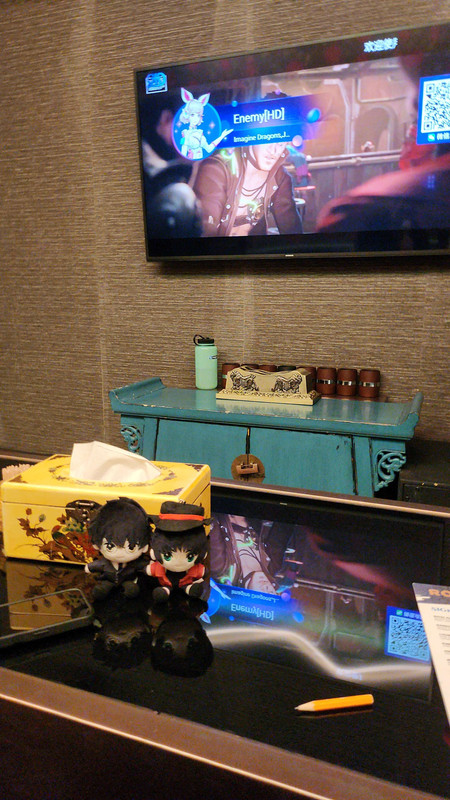 i hate public karaoke but private booths? lets fuckin go lmao. there's a place about 10 minutes from me so i wanted to go to celebrate my (now belated) birthday. amazingly, most of everyone was able to go! so it was me, kyle, will, j, aria, matt, and jorie! this place was wicked nice, you could order food and drinks and whatnot and each room had its own PRIVATE BATHROOM. the machines were all in mandarin so it was fun trying to figure out what did what lol but they had a great selection of songs.