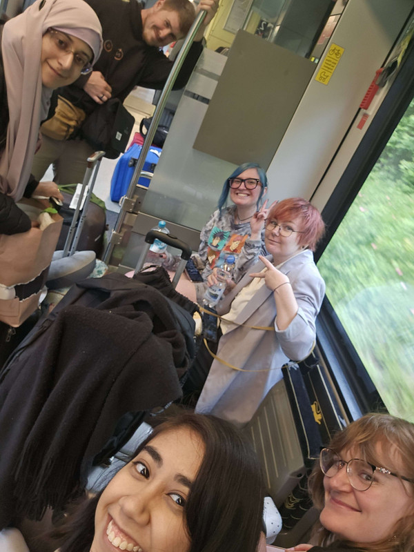 friday: WEDDING DAY!!!! we left on our first train at around 10am, though that was a 20 minute delay so great start lol. there were some guys in our reserved seats on our first train and they were PISSED when we told them they had to move. lmfao. but anyways the first train was so smooth BUT OUR TRANSFER. WAS A WHOLE THING. so because our train was delayed, our connection transfer time went from 15-ish minutes to THREE. THREE SINGULAR MINUTES. so we found out dicey/dina/sapphy were on the same connecting train as us and they were like RUN. BOOK IT. GO GO GO GO. and somehow miraculously not only did we MAKE IT but they managed to get the conductor to HOLD THE TRAIN FOR US FOR A MINUTE? like legit we got on doors closed lmfao. it was wild. but we made it!!! and off to the venue we went: