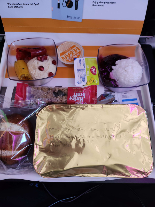 monday: returning from germany.... the morning was a bit rough as kyle was still pretty irritated with me from the argument we'd had the night before OTL but we worked it out. red came with us to the airport, which was an adventure.... fuck the frankfurt airport lmao. she was not on our flight this time around so it was just me and him. he slept through most of it, i played a bit on my vita but mostly i reread the entirety of x on the flight.. that was fun. it helped a bit with the terrible fear of flying anxiety LOL. the food i bought for us on the plane also rocked. the covered thing is curry with tofu!