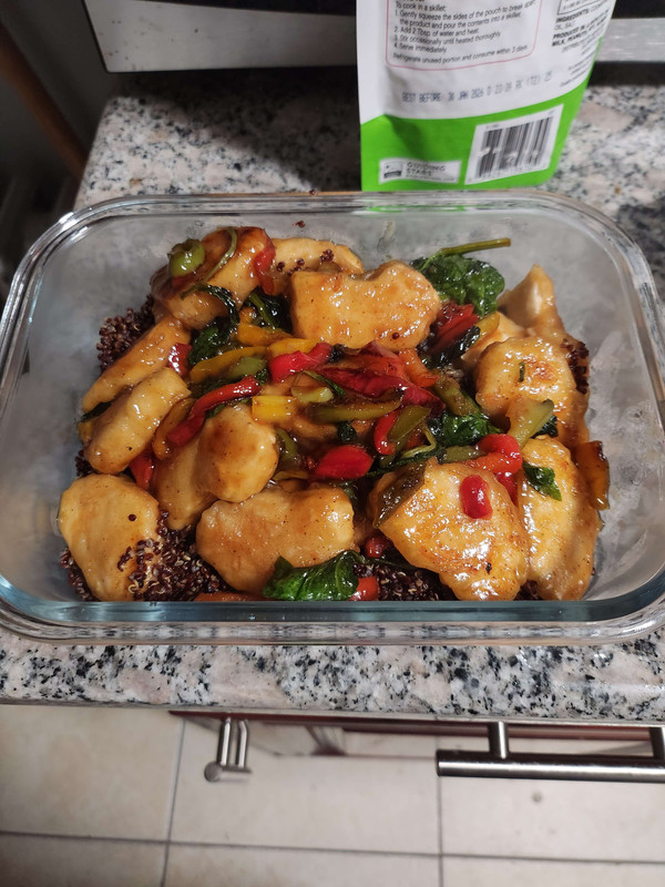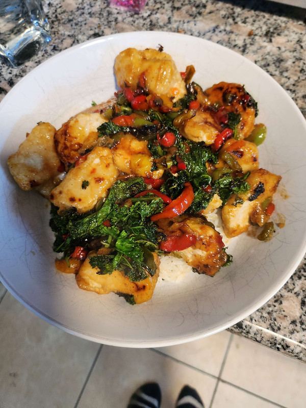 friday: grocery day! which is always fun. allows me to make some good meals like this, which is fake orange chicken, kale, mixed peppers, and garlic with an orange sauce: