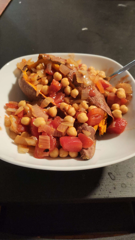 they sure made some interesting choices, though. and this is actually a complete tarot deck! not just the major arcana! i was PSYCHED to see that. not that i don't have a million decks already and have another on the way currently... i just really like tarot lol. other monday things... mostly chores, honestly? lots of chores lol. i dropped off some mercari packages at the post office, i did some laundry, mailed our state voting ballots, put on the new english dub season of pokemon horizons while folding laundry, the usual. played some zzz of course. oh! and i made a really good dinner of those sweet potatoes and chickpea tomato sauce thing: