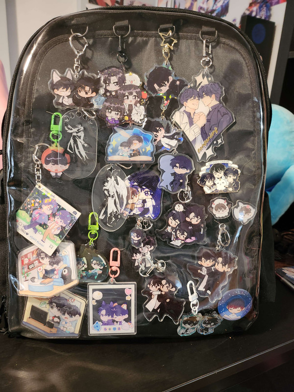 i will say i am more of an ita bag purist - these my only bags that are entirely fanmerch. most of my bags are 100% official and done more traditional ita bag style lol. i actually really dislike pin-based ita bags. they just do not have the same vibe. but i love beefleaf and it's not that many pins so i take it. plus, cute little shark bag..... it's perfect for beefleaf...... and my joongdok bag is like 20% spod and/or yoohankim but that's fine LOL that's just how canon goes anyway. orv truly has some talented fanartists, i have a ton of orv art up around my desk and it makes me emotional sometimes still even tho i see it every single day lol.