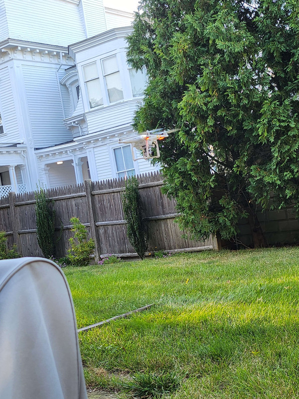 anyways, after kyle helped out jason with some moving logistics, off we went to RI. i was under the impression - as was kyle - that it would just be us and his parents. but his grandmother and aunt were there too. i love my in laws, really, but i am an introvert and they are the loudest group of extraverts i've ever met in my entire life. first thing was while his grandmother and aunt were getting ready to head to dinner, kyle's dad brought out his old drone to give to kyle. okay to explain my fil does filmography for a living and thus owns a newer drone. his old ("old") 2021 drone he no longer needs, so he's giving kyle some lessons and handing it off, which is super cool. they were flying it around for a bit which was neat as hell. i'd never actually seen one up close before: